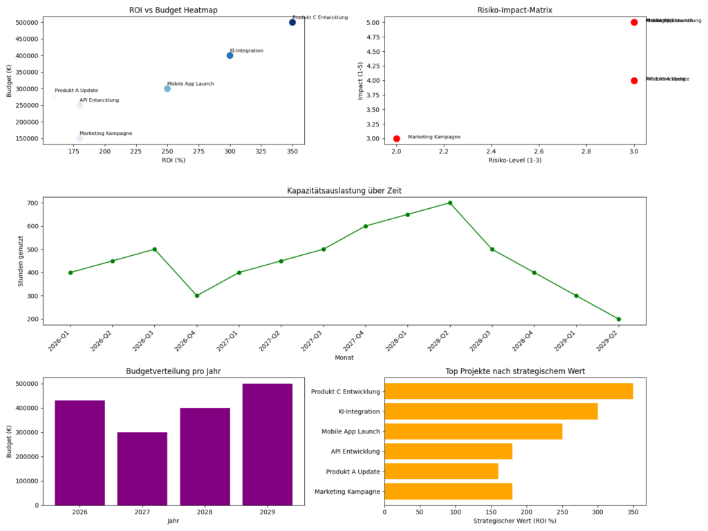 Künstliche Intelligenz (KI) im Projektmanagement und PMO Webinare zu KI: Webinar am Mittwoch, den 18. März 2026 von 18-19 Uhr CET KI (Künstliche Intelligenz) im Projekt- und Projektportfoliomanagement – Das KI-gestützte PMO: Governance, Effizienz und Transparenz mit dem Microsoft Copilot® Anmeldung unter: https://3pworx.com/meetup-event/ki_im_pm_pmo_ms_copilot/ Webinar am Donnerstag, den 11. Juni 2026 von 18-19 Uhr CET Maximale Performance im PMO – Ihr PMO als KI-Profitcenter: Mit KI-Agenten und Microsoft Copilot® Projekte rechtssicher steuern und skalieren Anmeldung unter: https://3pworx.com/meetup-event/pmo_ki_profitcenter/ Erfolgreich und schneller sein mit der nahtlosen Integration von Künstlicher Intelligenz (KI) ins Projekt- und Portfoliomanagement. Sie suchen eine Beratungs- oder Servicedienstleistung, um KI in Ihr Unternehmen / PMO sinnvoll und zielgerichtet einzuführen? Sie suchen KI – Tools / Plattformen wie z.B. Google AI, SAP AI, ChatGPT oder den Microsoft Copilot, der Ihnen eine wertvolle (automatisierte) Unterstützung zusätzlich in Ihren Projektmanagement – Prozessen und PM Organisationen liefert? Sie suchen KI-Modelle und Frameworks, wie z.B. Citizen AI oder Azure AI Dienste um komplexe Aufgaben zu automatisieren und die unternehmerische Effizienz zu steigern? Sie suchen einen Prompts Entwickler, der Ihnen hilft die Eingabeaufforderungen zu bauen, um mit Ihrem KI System zu interagieren? Wir haben die passende Lösung für Sie: 3Pworx GmbH kann die Potentiale für KI in Ihrem Unternehmen analysieren und Sie von der KI – Zielsetzung, Strategie bis hin zur nachhaltigen Realisierung begleiten. Weitere Services für Sie: Ihr Unternehmen mit KI strategisch und taktisch-operativ ausrichten Business und IT Transformation mit KI begleiten und realisieren KI mit Projekt- und Portfoliomanagement / PMO verbinden Nutzungspotentiale mit KI analysieren, bewerten und aufzeigen KI – Integrationen zu anderen Tools realisieren Microsoft Copilot einführen und im Unternehmen nachhaltig und erfolgreich ausrollen KI Prompts erstellen für Ihr KI-Modell, um eine spezifische Aufgabe zu erledigen Beispiel: KI Analysen fürs Projektportfolio: ROI vs Budget Heatmap – zeigt ROI im Verhältnis zum Budget. Risiko-Impact-Matrix – bewertet Risiko gegen strategischen Impact. Kapazitätsauslastung über Zeit – Auslastung der 5 Mitarbeiter über Projektphasen. Budgetverteilung pro Jahr – Balkendiagramm für jährliche Budgets. Top Projekte nach strategischem Wert – Ranking basierend auf ROI. Die 3Pworx GmbH hat sich mit Dienstleistungen und Tools auf das Thema KI im Projektmanagement spezialisiert. Wir erarbeiten mit Ihnen weitere Möglichkeiten und Lösungen, entwickeln mit Ihnen Fachkonzepte und setzen diese gemeinsam in Kooperation mit unserem Team in Ihrem System um. Gerne stehen wir Ihnen als Ihr kompetenter Partner in jeder Projektphase als professioneller Ansprechpartner zur Verfügung. Unser Team setzt sich aus hochmotivierten und fachkompetenten sowie sehr erfahrenen PM KI-Beratern, KI Coaches und KI IT Experten zusammen, um mit Ihnen gemeinsam alle Herausforderungen zu bewältigen. Interessiert? Gerne können wir mit Ihnen zielorientierte Lösungen und Tools diskutieren. Wir bieten Ihnen zudem schnell und passgenau die richtige Kompetenz auf Basis Ihrer Anforderungen. Senden Sie uns Ihre Anfrage. Bei Anfragen nutzen Sie bitte unser Kontaktformular. Sie können uns auch direkt eine E-Mail an contact@3pworx.com senden oder rufen Sie uns einfach an unter Tel: +49 (0)89 44 23 86 50